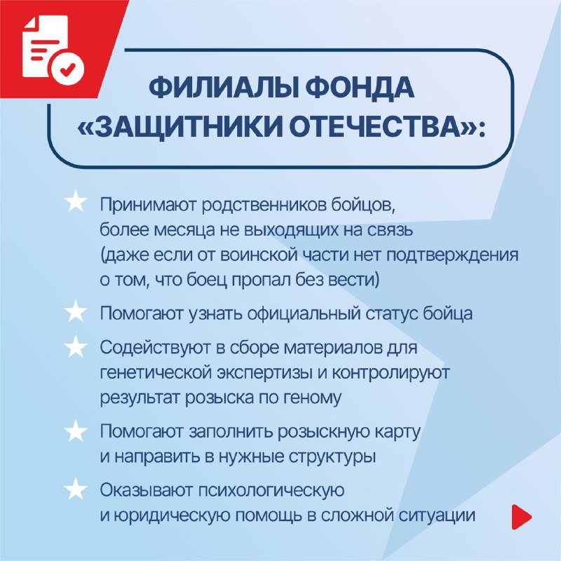 В филиале фонда родные и близкие пропавших бойцов могут сдать генетический материал (буккальный эпителий) БЕСПЛАТНО! для проведения ДНК-теста. Также сотрудники помогут оформить розыскную карту.