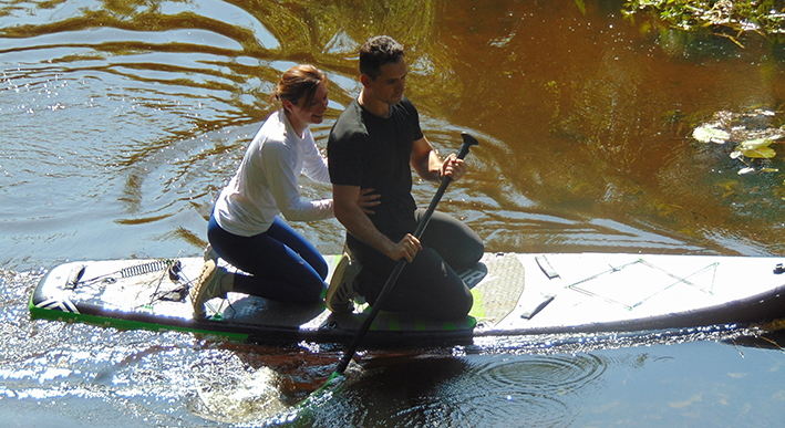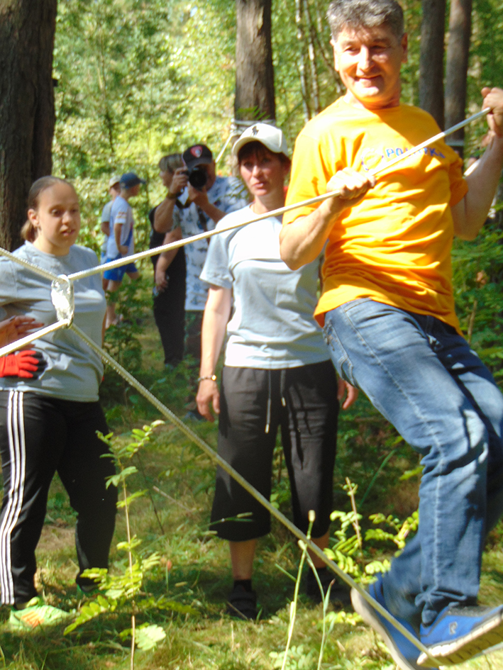 Потом все получили путевые листы и разошлись по этапам соревнований. На большой поляне команды проходили эстафету, которая была с туристическим уклоном – например, требовалось пилить и всем вместе переносить дрова, причём без рук. На «полосе выживания», оборудованной под кронами деревьев, нужно было пробраться через верёвочные препятствия и пройти по «бабочке» веревке, повешенной крестн-акрест над землёй, спуститься и подняться по крутым склонам, чтобы проплыть между этими точками по реке на пластиковой доске, пострелять, разжечь костёр и как можно быстрее нагреть до кипения воду в металлической кружке, используя деревянную рогатину в качестве ухвата, а также продемонстрировать навыки оказания первой медицинской помощи и переноски раненого на самодельных носилках.