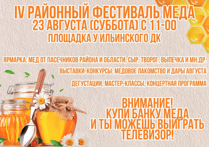 23 августа площадка перед Ильинским ЦКД в поселке Ильинское-Хованское состоится праздник меда. Начало в 11.00.