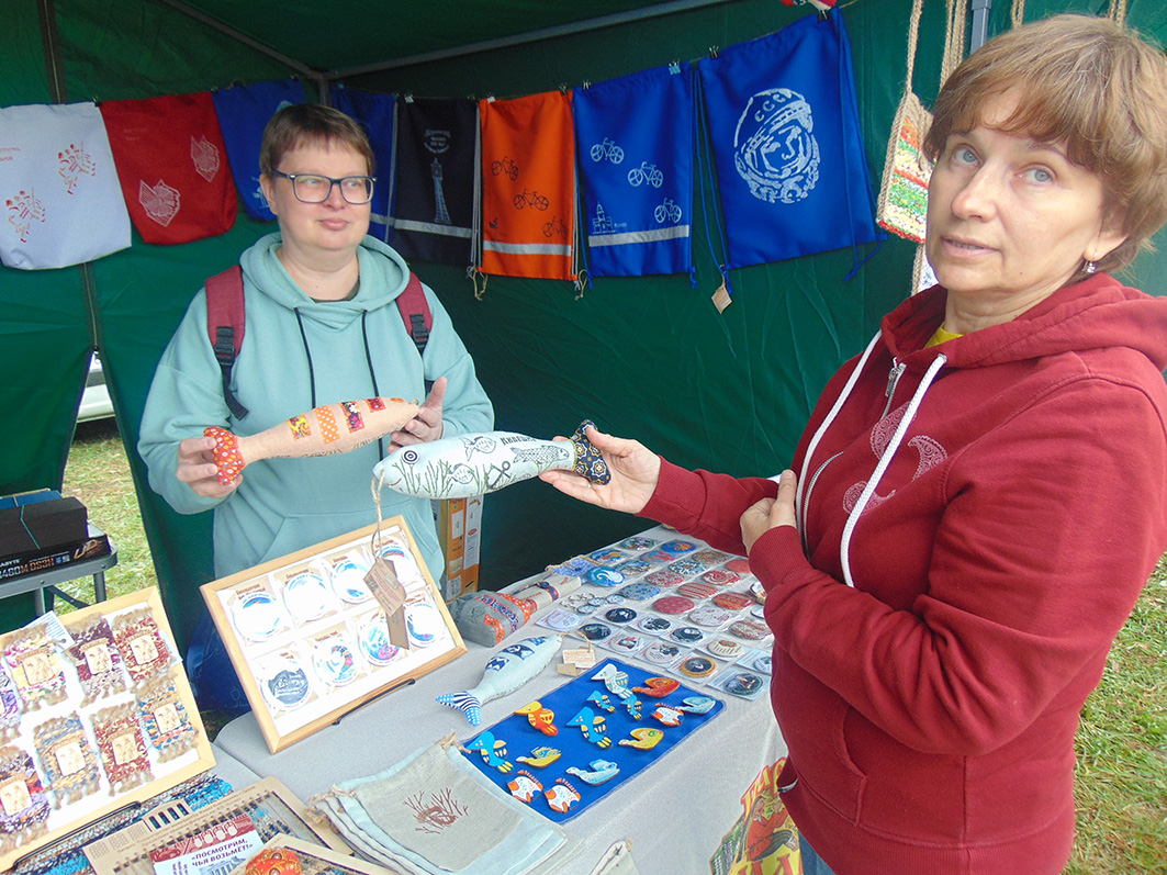 Ярмарка – возможность сделать себе полезные и приятные подарки: от продуктов, саженцев и рассады до оригинальных авторских изделий, которые продавали сами мастера. Так, всем уже очень полюбилась резьба по дереву Александра Савельева, уроженца Ижевска, пряники из пекарни «Васильевский пряник» Ирины Авериной, замечательные кованые изделия родниковца Анатолия Кузнецова. Нельзя было пройти мимо оригинальной линейки настольных игр, сувениров и сумок, сделанных волонтёрами и воспитанниками организации по работе с людьми с ограниченными возможностями «Грани» при библиотеке для детей и юношества на Крутицкой в Иванове. Рисунки на сумках светятся в темноте, игры не только развивают моторику, но и заставляют вспомнить ручное ткачество, а еще соревнование между ткачихами Виноградовыми из Вичуги и родниковками Тасей Одинцовой и Ириной Лапшиной, открытки с ретро-фото показывают вид первой фабрики-кухни, а на обороте имеют рецепт из «Книги о вкусной и здоровой пище». Здорово придумано! Оказалось, у нас в области творческую жилку помогают развить и монетизировать. Елена Лакеева из Иванова, торговавшая стильными изделиями собственного изготовления с использованием природного материала, отлично «прокачала» себя на акселераторе (обучающем тренинге) «Путь ремесленника» Екатерины Затуливетер и Елены Дворниковой из областного Координационно-методического центра культуры и творчества. Рукодельницы, возьмите на заметку!
