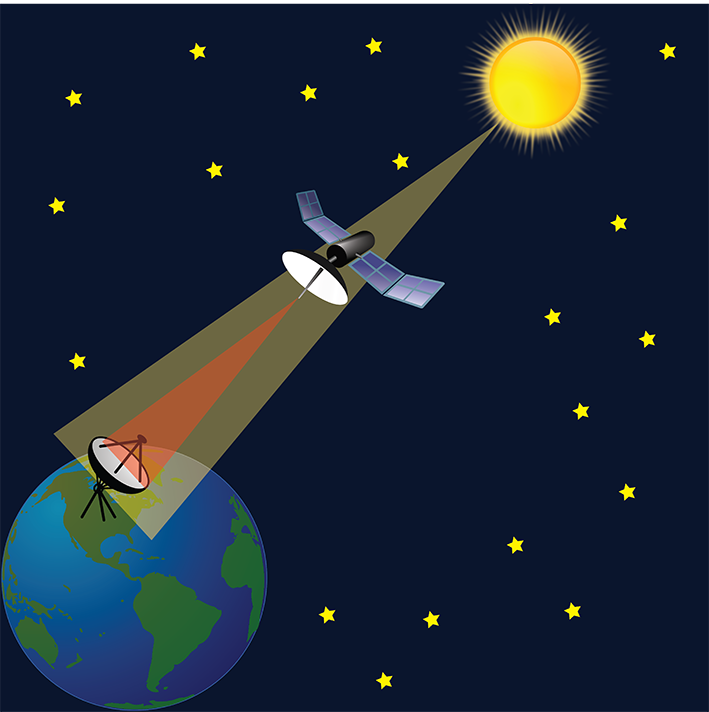 «Солнечное вещание» на одной линии со спутником связи и принимающей земной станцией может перебить телесигнал. Суть явления проще всего представить через аналогию: если позади свечи включить прожектор, свеча станет незаметна в потоке света. Расположение Солнца на прямой линии со спутником связи и земной приемной станцией длится несколько минут, затем благодаря вращению Земли вокруг своей оси спутник связи уходит из-под «солнечной засветки».