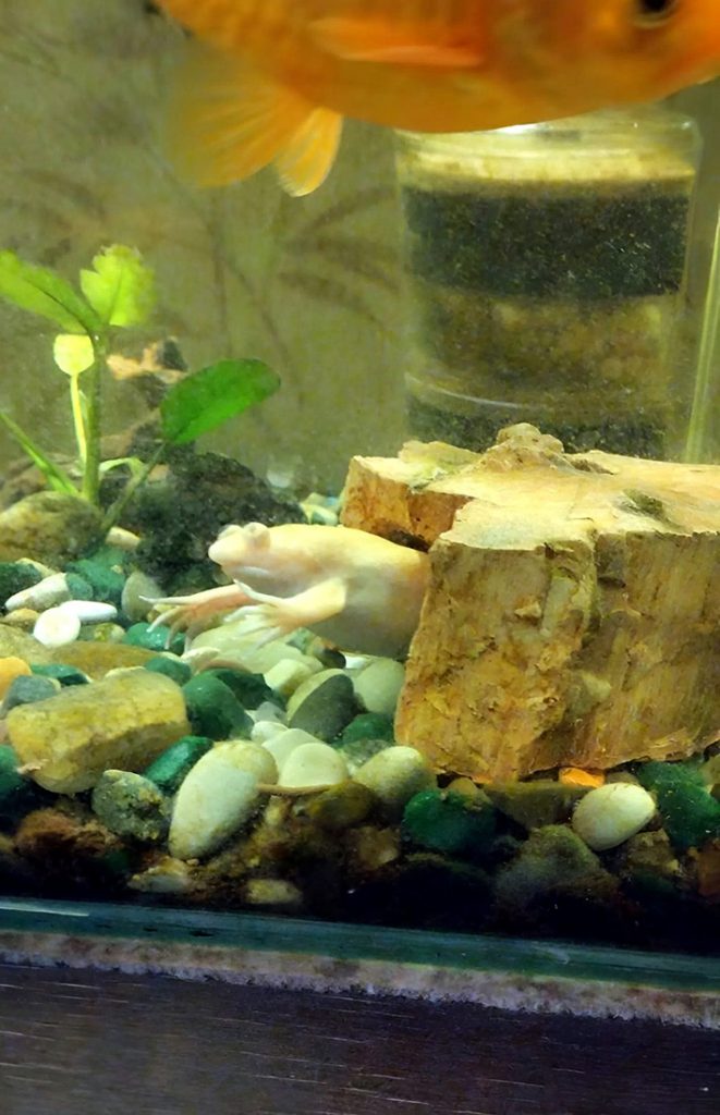 Они отлично уживаются с рыбами. Главное, чтобы рыбы были не хищниками и размером больше рта лягушки, чтобы не стать её добычей. Была у нас ситуация, когда сын купил двух новых рыбок-телескопов. Через несколько часов мы обнаружили пропажу одной новой рыбки, той, что была поменьше. Сразу же поняли, что рыбка у Люськи в животе глаза-телескопы предательски выпирали с боков и выдавали с головой нашу прожорливую хищницу.