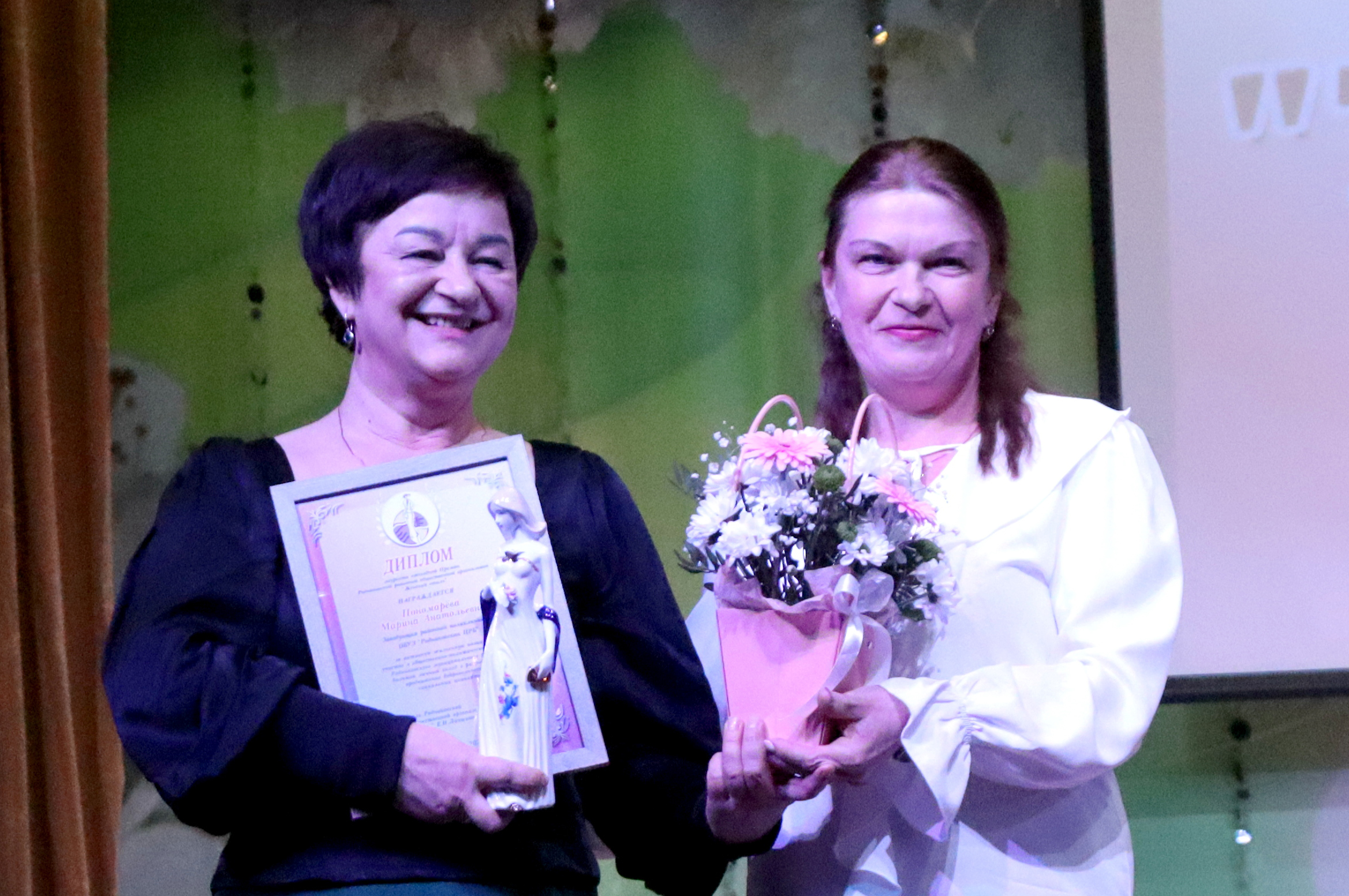 Председатель районной общественной организации «Женский стиль» Елена Лапшина (справа) вручила награду Марине Пономаревой, заведующей районной поликлиникой Родниковской центральной районной больницы,за активное участие в общественной жизни