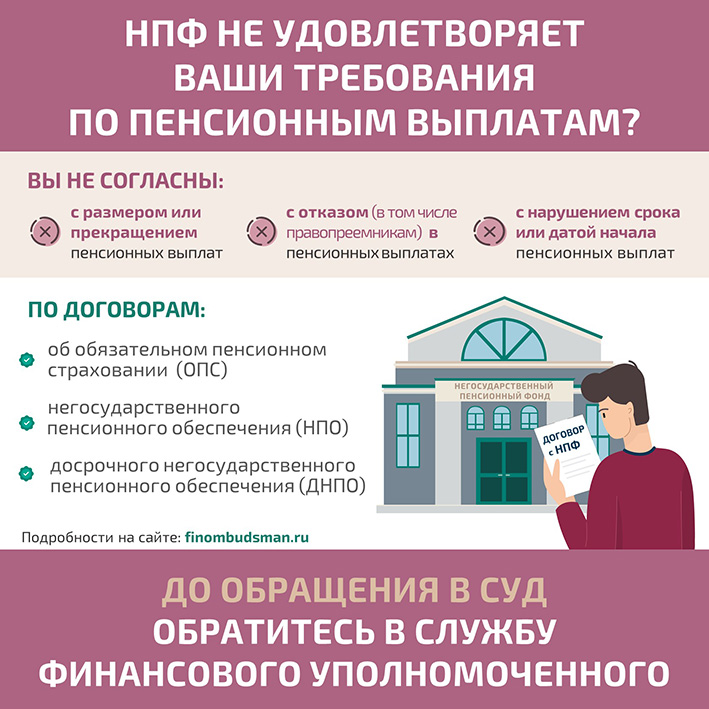 Финансовый уполномоченный по Закону* поможет вам абсолютно бесплатно, если НПФ отказался удовлетворить ваши требования по пенсионным выплатам, возникшие в рамках договоров об обязательном пенсионном страховании (ОПС), негосударственного пенсионного обеспечения (НПО), досрочного негосударственного пенсионного обеспечения (ДНПО), например, если вы не согласны: