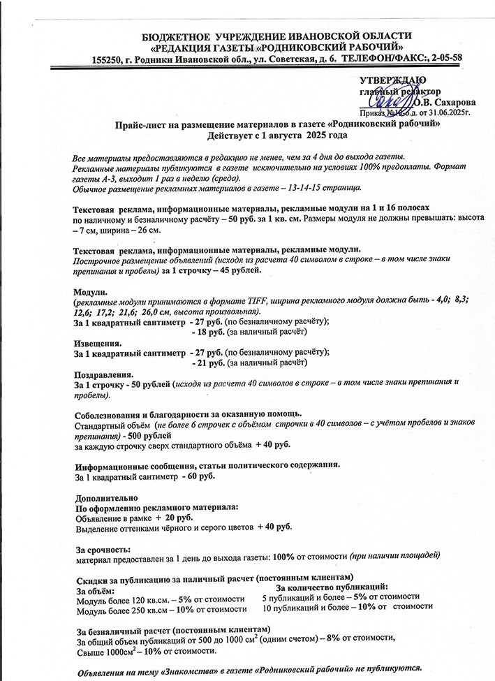 В этом разделе мы разместили для вас прайс-листы на подачу объявлений и рекламы в газету «Родниковский рабочий». Обратите внимание: в первом — указаны расценки на размещение в соцсетях, во втором — в печатной версии издания.