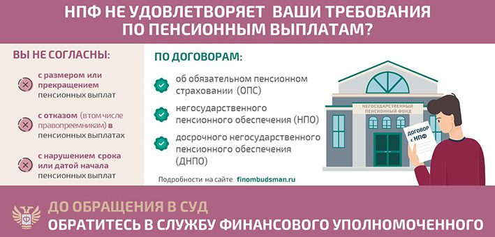 Возник имущественный спор с НПФ по пенсионным выплатам? Обратитесь к финансовому уполномоченному. Когда можно обратиться за помощью Финансовый уполномоченный по Закону* поможет вам абсолютно бесплатно, если НПФ отказался удовлетворить ваши требования по пенсионным выплатам,...